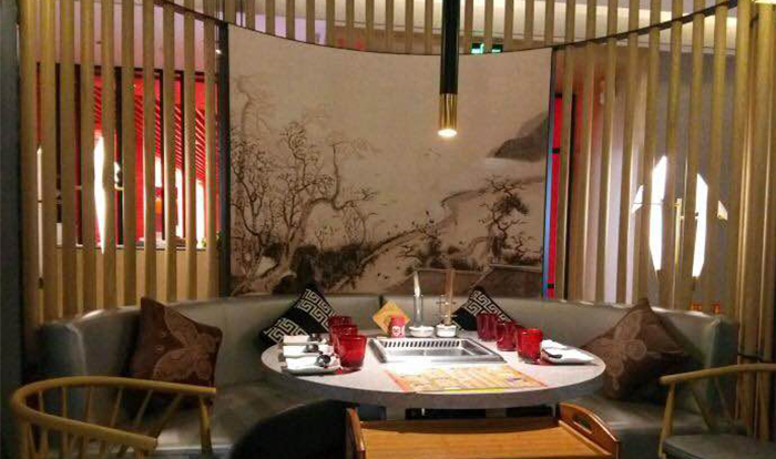 川山甲的餐廳裝修很是獨特,走進餐廳就仿佛進入了大自然,墻上的一幅幅山水畫非常美觀,透過木樁似的屏風看過去,一張張白色大理石方桌上擺著,精致的紅色杯子,別有風味。更重要的是選用了韓博智能無煙火鍋設備,吸油煙率高達99%,使餐廳再無油煙味彌漫,餐廳也顯得很溫馨,很優雅。
